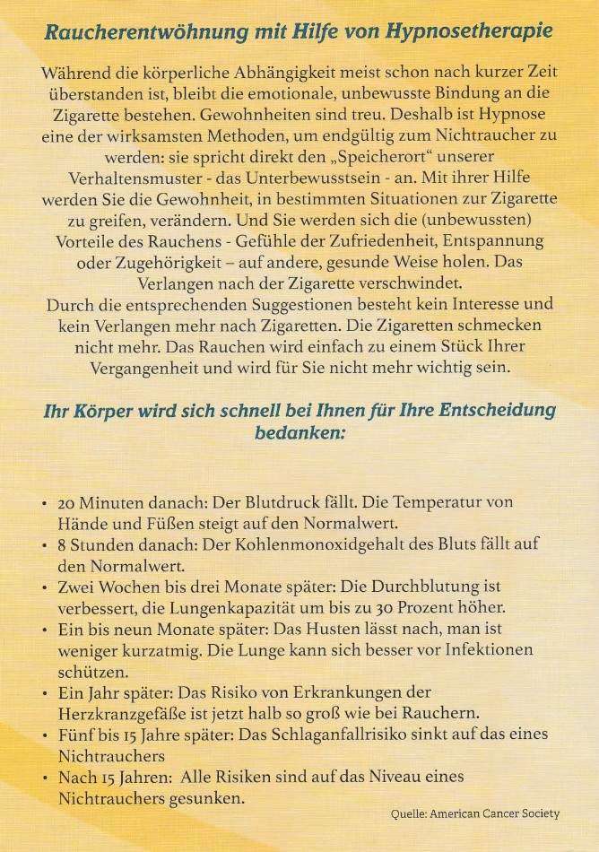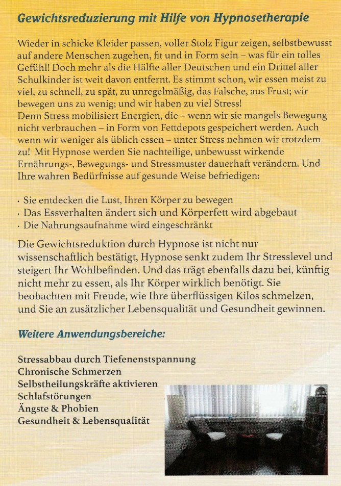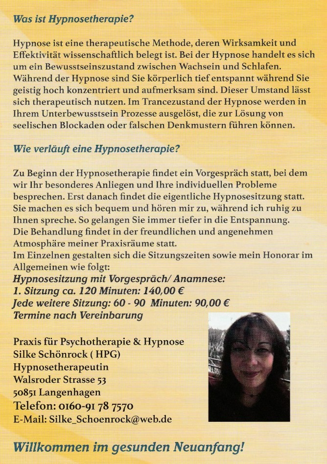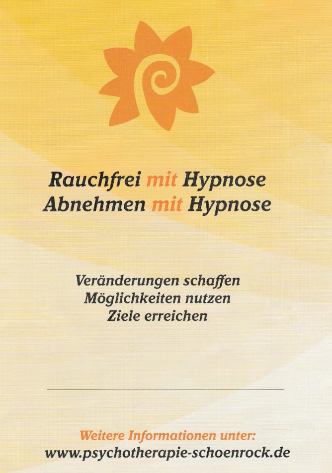 Praxis für Persönlichkeitsentwicklung und Hypnosetherapie Tel: 0160-917 875 70 Email: info@psychotherapie-schoenrock.de